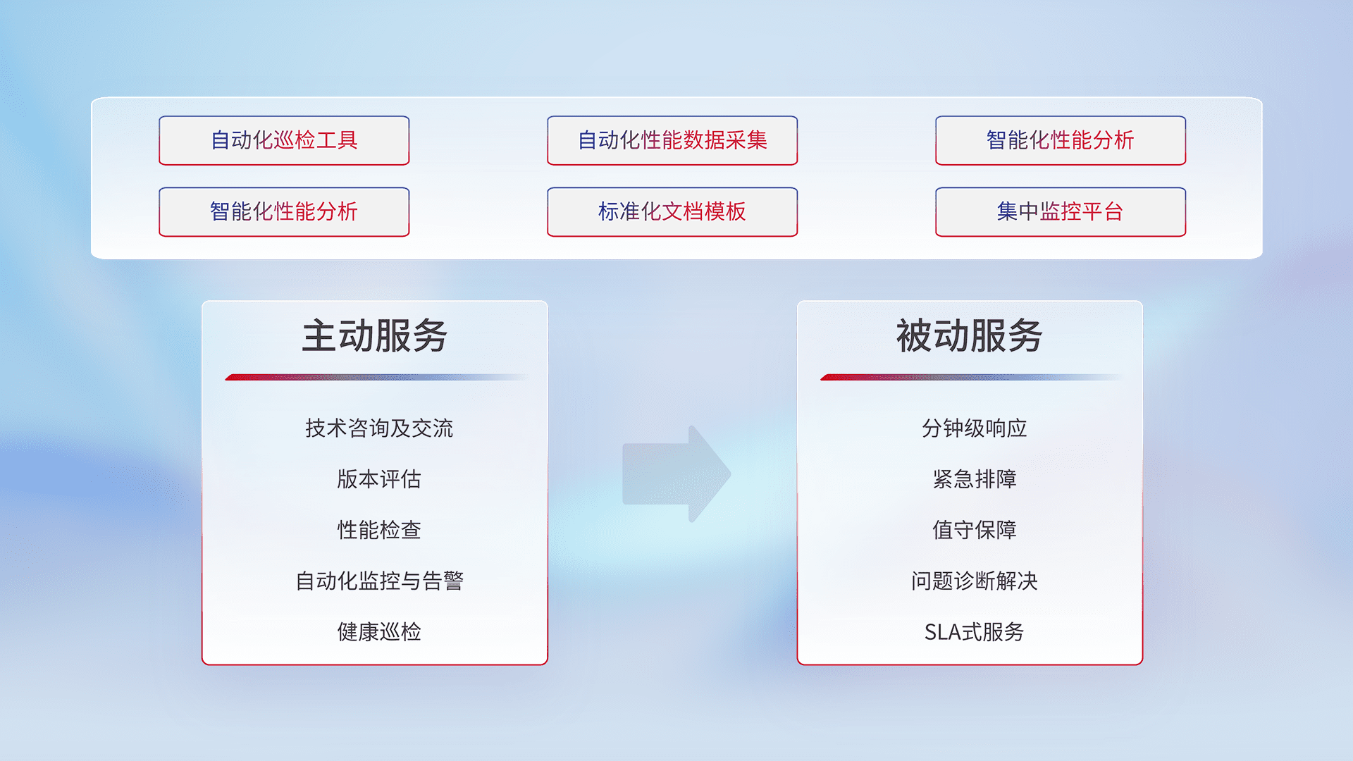智能化工具和标准化文档,,,,保障服务质量,,,提供主动服务(包含技术咨询、、、版本评估、、、性能检查、、自动化监控与告警、、健康巡检)和被动服务包含(分钟级响应、、、紧急排障、、、、值守保障、、、、问题诊断解决、、、、SLA服务)。。